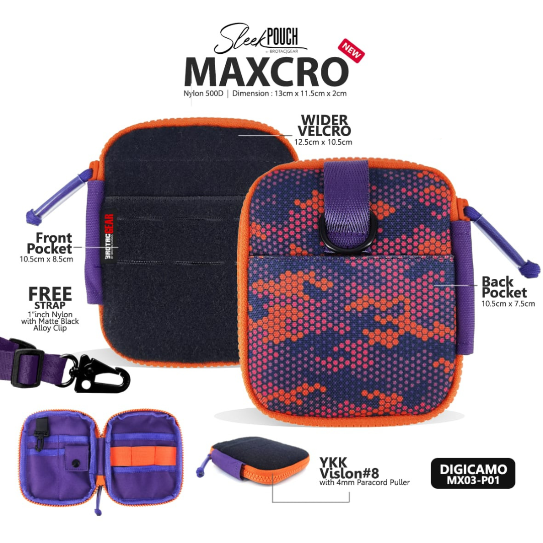 The new MaxCro – the second generation of Sleek Pouch from BrotacGear.  The MaXCro’s front exterior offers a full Velcro real estate to show off your patches and it has an integrated laser-cut molle panel to accommodate up to 3 molle clips.  The internal organisation is neat & streamlined and will fit in your favourite EDC items nicely.  The fixed keychain in the previous Sleek Pouch has been replaced with a MaXCro has a detachable keychain in the MaXCro.  The two external pockets provide you with quick access to cards and cash without the need to unzip the pouch making MaXCro your choice of EDC pouch.