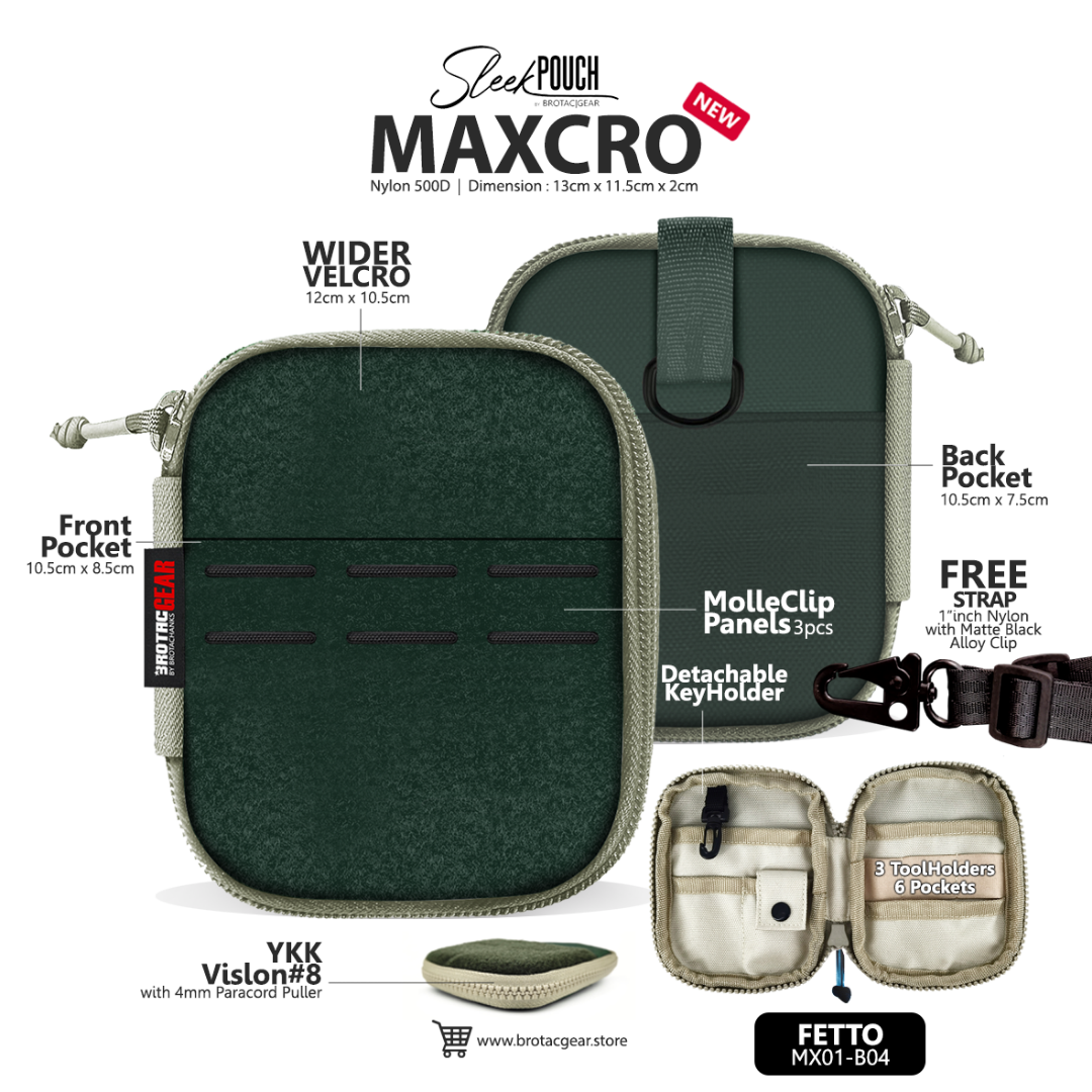 The new MaxCro – the second generation of Sleek Pouch from BrotacGear.  The MaXCro’s front exterior offers a full Velcro real estate to show off your patches and it has an integrated laser-cut molle panel to accommodate up to 3 molle clips.  The internal organisation is neat & streamlined and will fit in your favourite EDC items nicely.  The fixed keychain in the previous Sleek Pouch has been replaced with a MaXCro has a detachable keychain in the MaXCro.  The two external pockets provide you with quick access to cards and cash without the need to unzip the pouch making MaXCro your choice of EDC pouch.