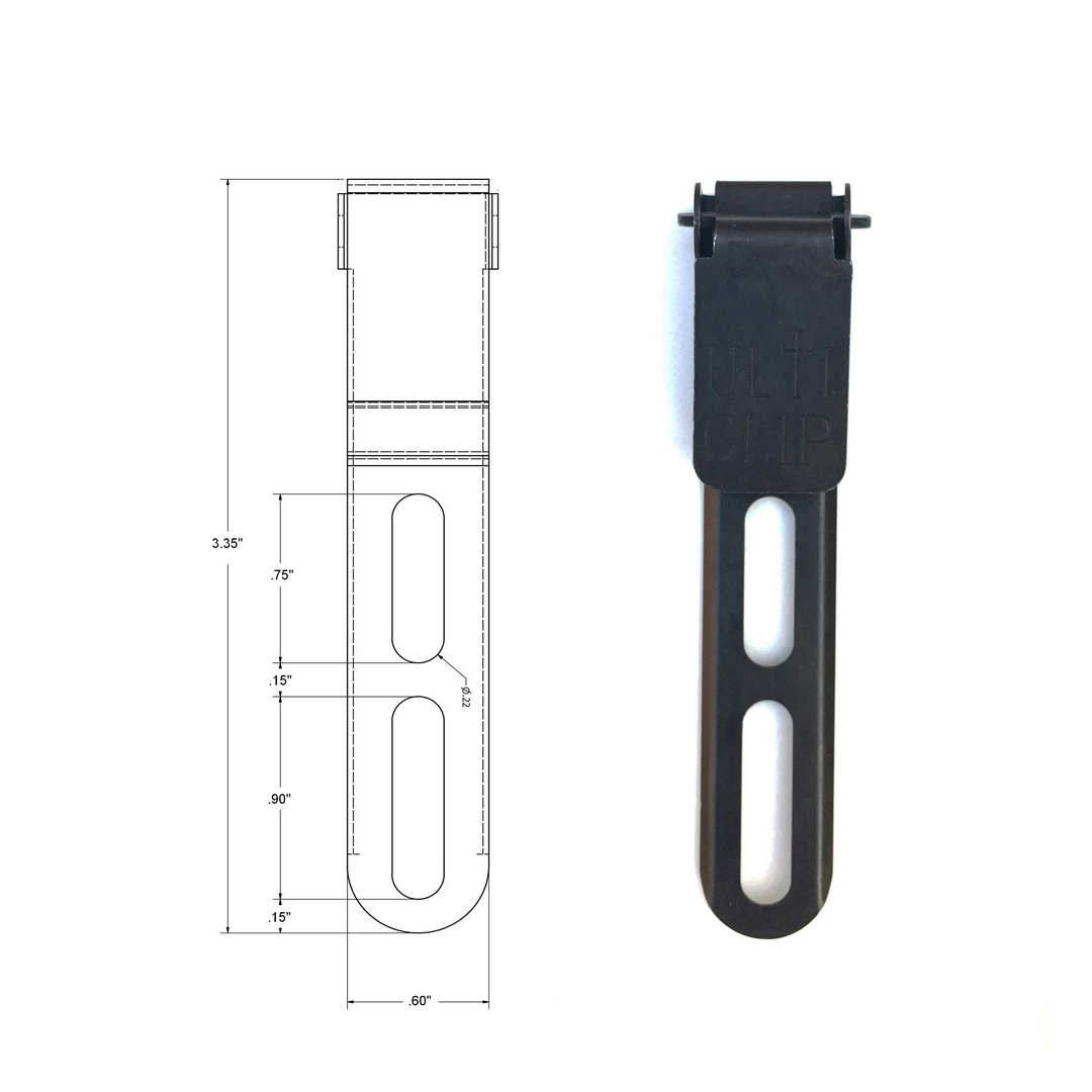 The Ulticlip Slim 3.3 provides great retention and concealment.  It has a dual slotted mounting area that  allows for 1.5″ hole spacing.  The Slim 3.3 is slightly over 1/2″ wide making it ideal for knife sheaths or other narrow applications.